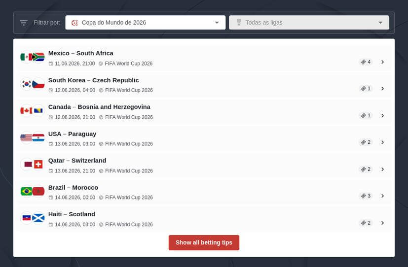 O Campeonato do Mundo é o evento mais importante do futebol a nível global e aquele que gera maior volume de apostas durante o seu período de realização. A combinação de seleções nacionais, elevada imprevisibilidade e enorme cobertura mediática torna este torneio altamente relevante para os mercados de apostas. A final do Mundial de Futebol é o evento esportivo mais visto do mundo, reunindo cerca de um bilião de espetadores a cada quatro anos. Este evento destaca-se especialmente em mercados como resultado final, handicaps, over/under de golos e apostas em fases eliminatórias, onde a pressão competitiva aumenta a volatilidade das odds.