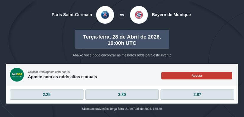 A bet365 mantém páginas dedicadas ao PSG e à Champions League com uma oferta alargada de mercados, com opções como 1X2, ambas marcam, over/under, handicap asiático e mercados de marcadores. Ainda assim, compara sempre os preços oferecidos, porque as odds PSG vs Bayern mudam com frequência até ao pontapé de saída.